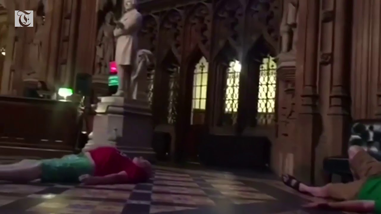 Campaigners against building a new runway in London's Heathrow stage a "lie-in" protest at the UK parliament's central lobby of the Houses...